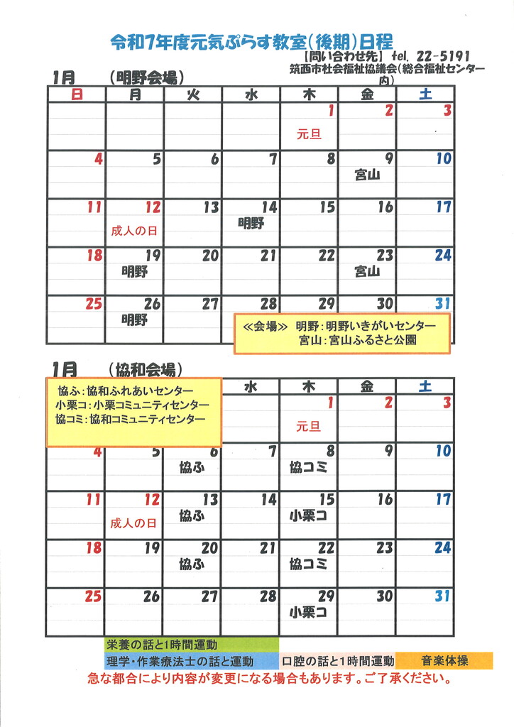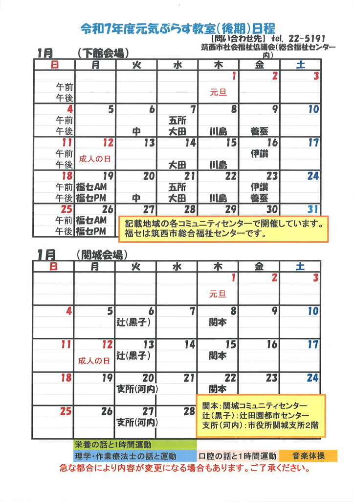 2025年12月18日 / 最終更新日 : 2025年12月18日 筑西市社会福祉協議会 元気ぷらす教室 元気ぷらす教室 カレンダー(1月)元気ぷらす教室1月分日程表です。各会場にてお持ち帰りもご用意しておりますので、職員までお声かけください。