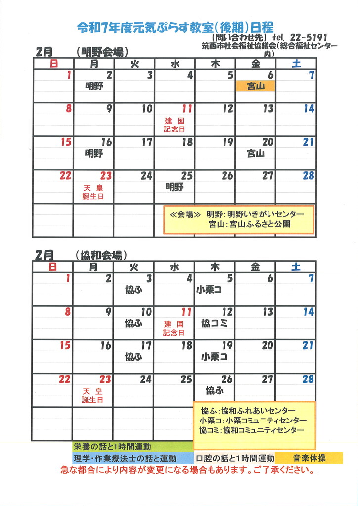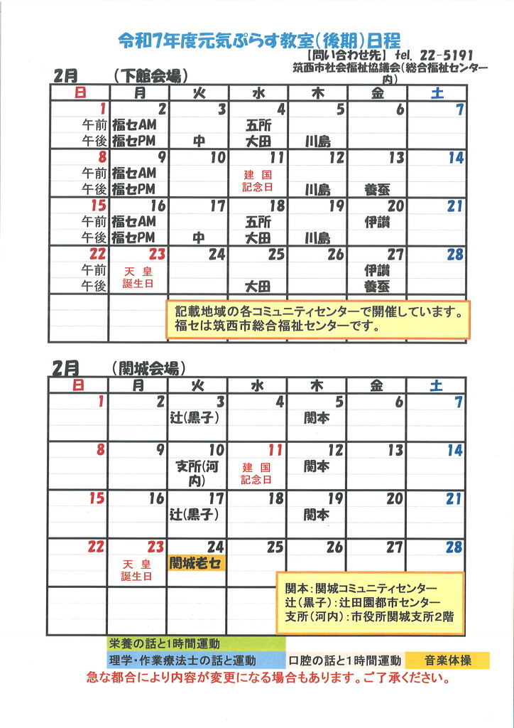 2026年1月19日 / 最終更新日 : 2026年1月19日 筑西市社会福祉協議会 元気ぷらす教室 元気ぷらす教室 カレンダー(2月)元気ぷらす教室2月分日程表です。各会場にてお持ち帰りもご用意しておりますので、職員までお声かけください。