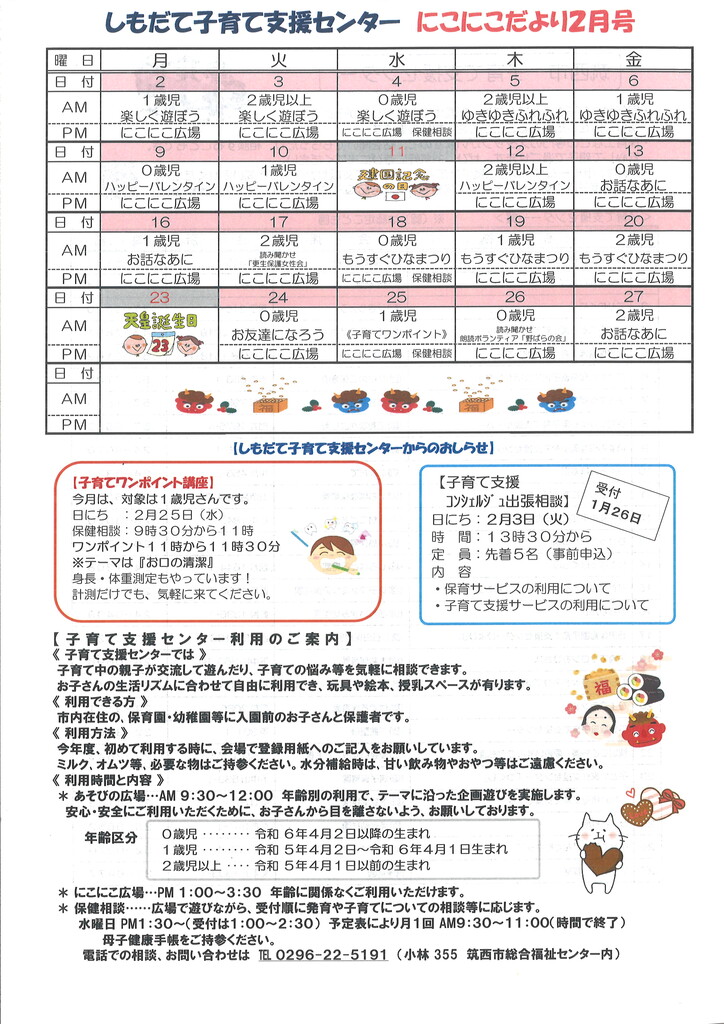 2026年1月19日 / 最終更新日 : 2026年1月19日 筑西市社会福祉協議会 子育て支援センター しもだて子育て支援センター にこにこだより(2月号)子育て支援センターにこにこだより2月号です。来所された方には持ち帰りもご用意しておりますので、職員までお声かけください。