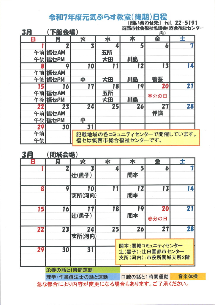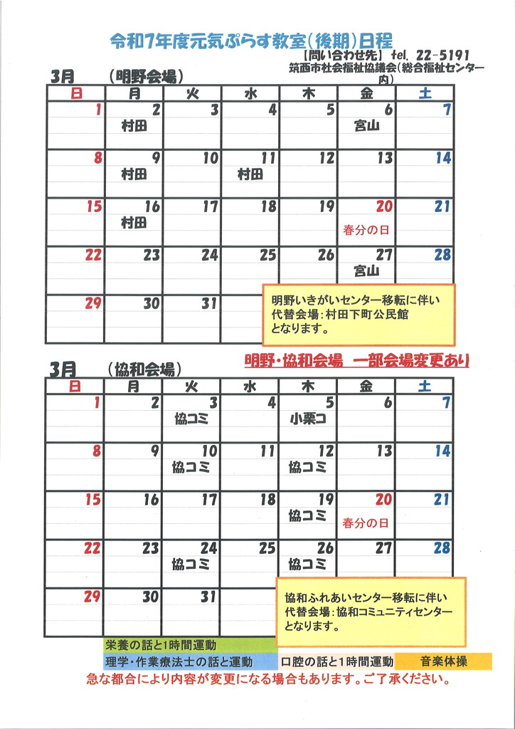 2026年3月2日 / 最終更新日 : 2026年3月2日 筑西市社会福祉協議会 元気ぷらす教室 元気ぷらす教室 カレンダー(3月)元気ぷらす教室3月分日程表です。各会場にてお持ち帰りもご用意しておりますので、職員までお声かけください。